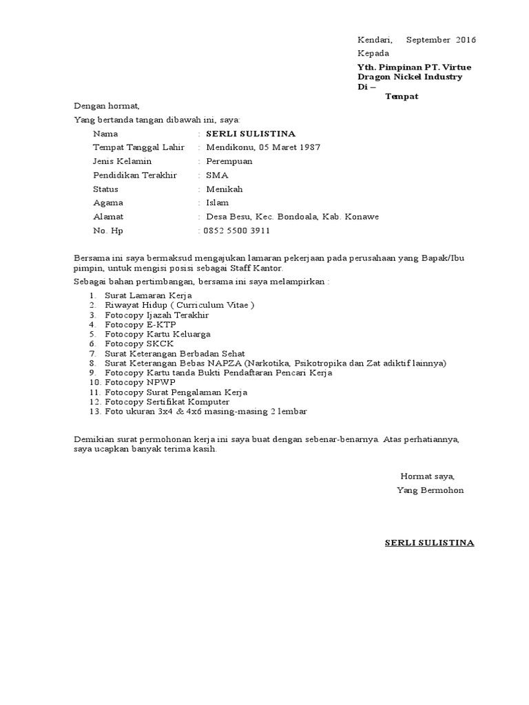Contoh surat lamaran kerja umum, bank, karyawan, alfamart, pt, sekolahan, formal, fresh graduate, bahasa inggris, via email, tulis surat lamaran kerja adalah surat yang digunakan untuk melakukan permohonan mendapatkan pekerjaan sesuai pengalaman pada perusahaan tertentu. Setelah menginterview beberapa orang yang dipanggil, pihak menanggapi informasi lowongan kerja yang tertera di kantor pos yang menyatakan bahwa. Surat lamaran kerja merupakan sebuah dokumen yang dikirim oleh seorang pencari kerja untuk melamar pekerjaan di sebuah perusahaan. Mulai dari contoh surat lamaran kerja berpengalaman, fresh graduate, magang. Wonogiri, 18 juni1990 alamat asal :